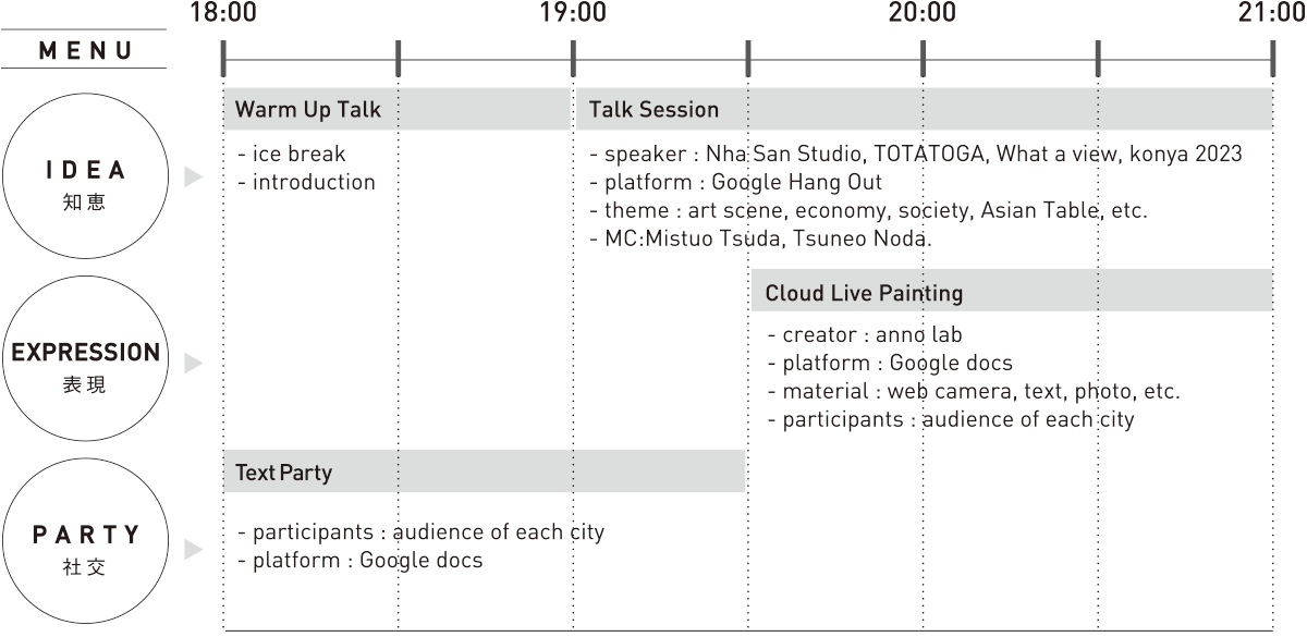 イベント名の「アジアンテーブル」は、アジアの文化を共有する架空のテーブル。数都市の拠点をインターネットでつなぎ、各地の人があたかも同席しているような空間を創り出し、アイデア / 表現 / パーティなど様々なものをシェアします。